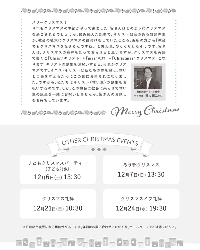 お知らせ 2025年クリスマス その他イベントのお知らせ キャンドルサービスの他にも、様々なクリスマスのイベントがございます。 ぜひ、あわせてお越しください! ※12月6日(土)Jともクリスマスパーティーは、【14:00~】に変更となっております。ご注意ください。
