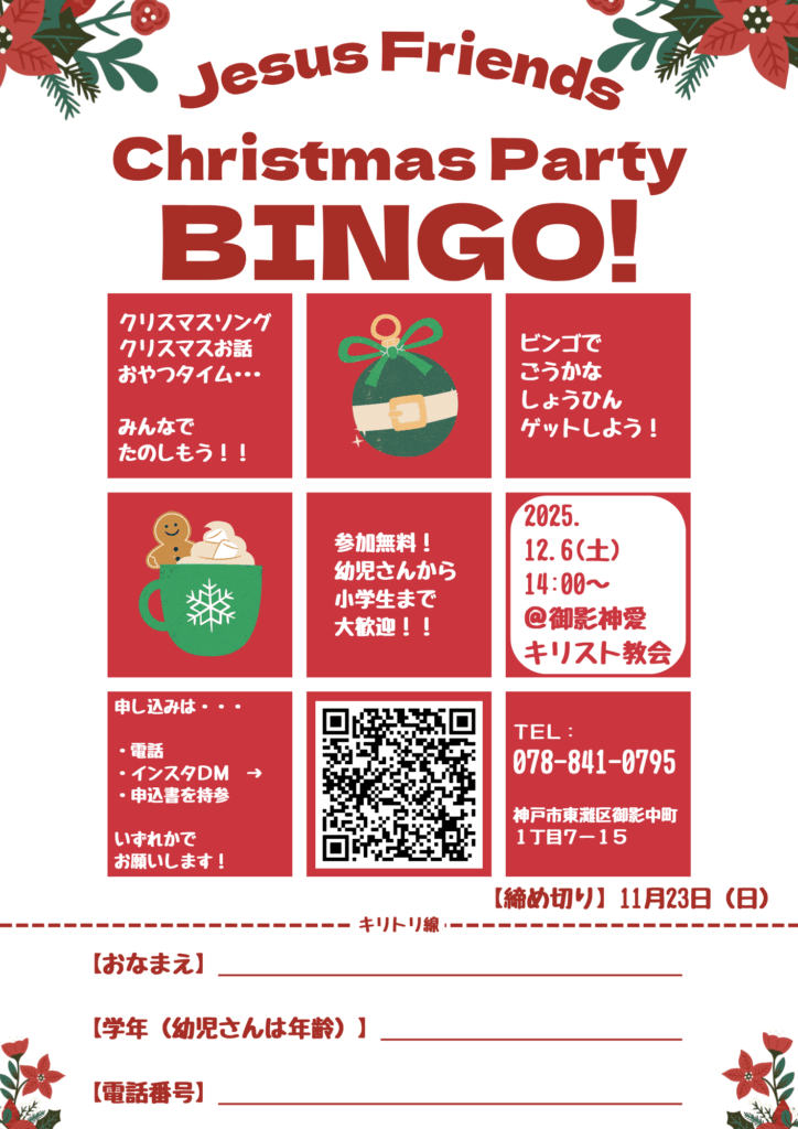 お知らせ Jともクリスマスパーティー(子ども対象)のお知らせ 【日時】 12月6日(土)14:00~ ※当初の13:30~から開始時間が変更となっております。ご注意ください。 ビンゴで豪華な景品が当たる!? チキンにケーキにお菓子、クリスマスのお話と歌で、楽しい時間を過ごしましょう! お申し込みは ・教会に電話(078-841-0795) ・インスタDM(Jとも公式インスタグラム) ・教会へ申込書を持参 いずれかにてお願いいたします。 ぜひお越しください!